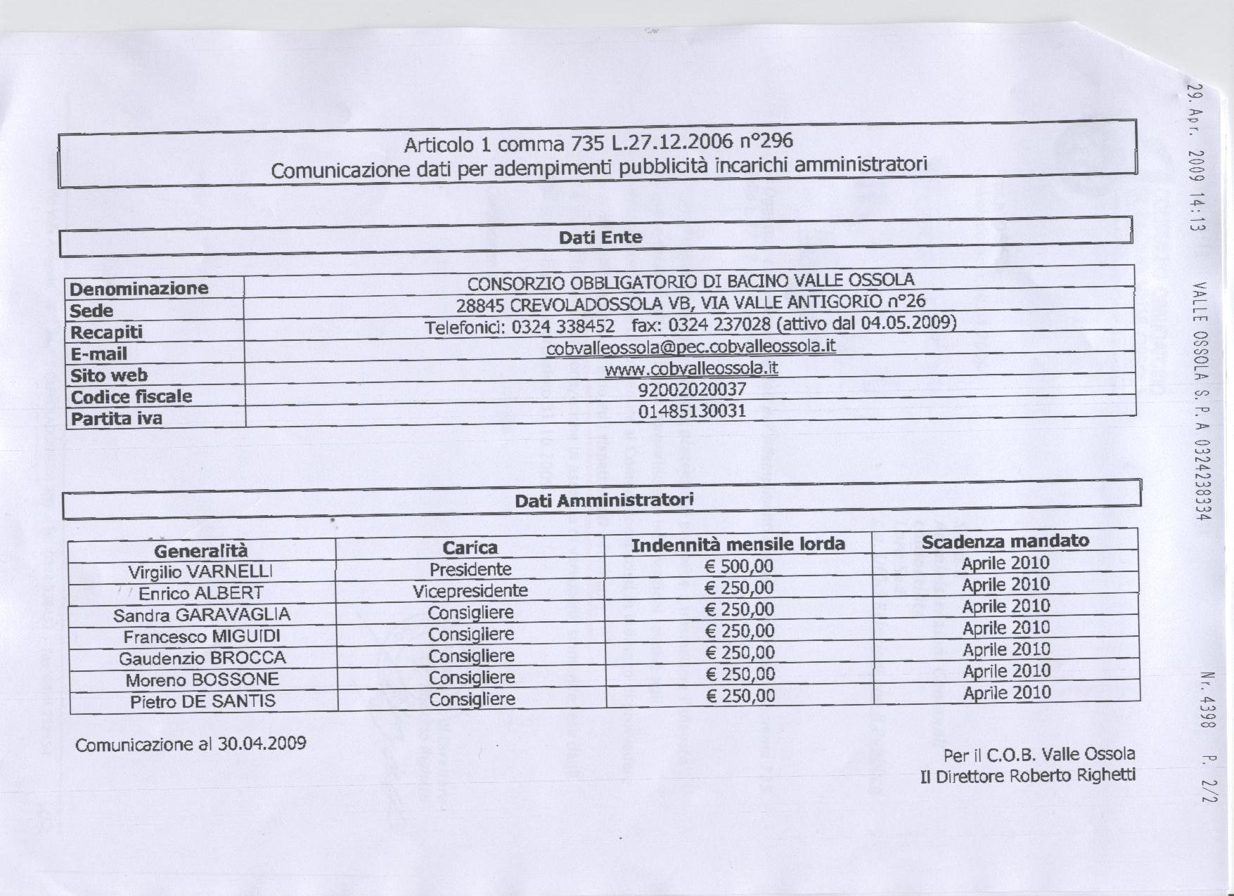 Art. 1 Comma 735 Legge 27/12/2006 n° 296 - Incarichi amministratori società partecipate